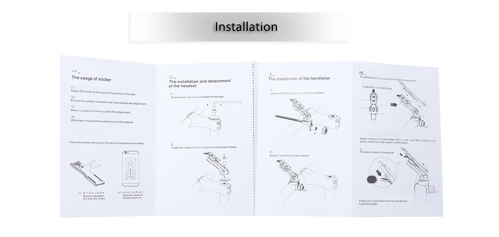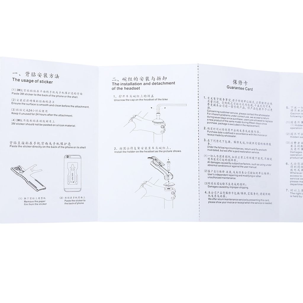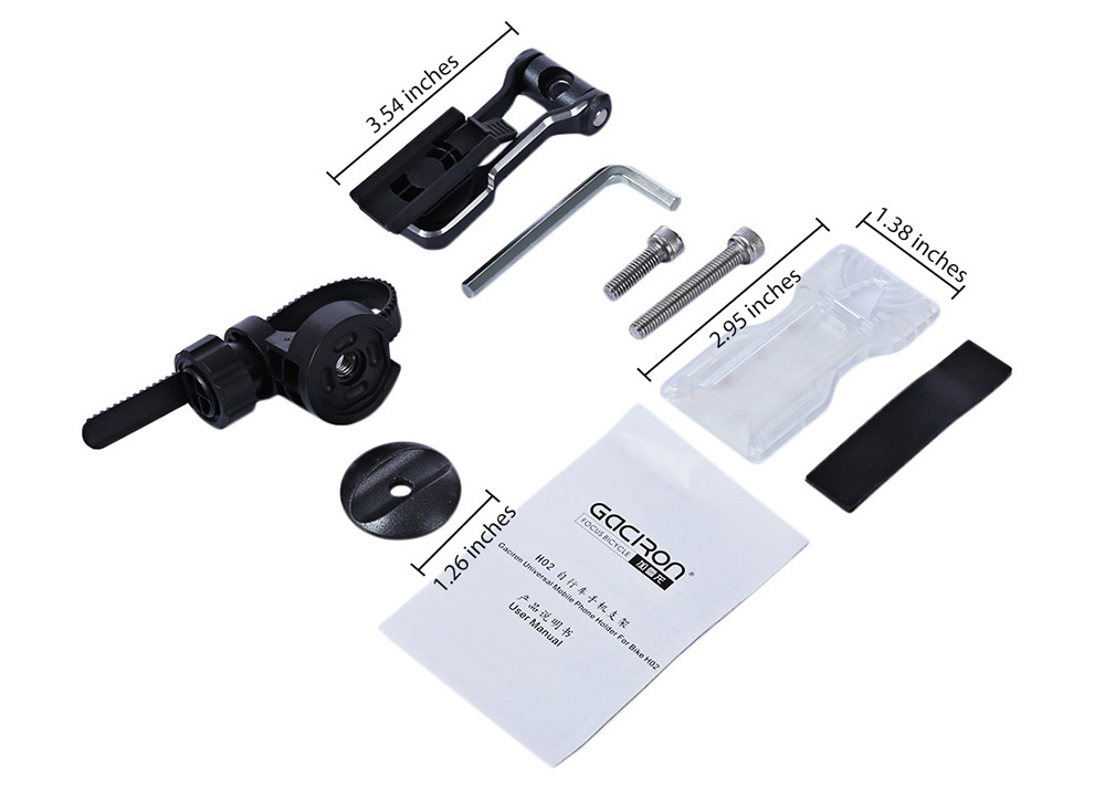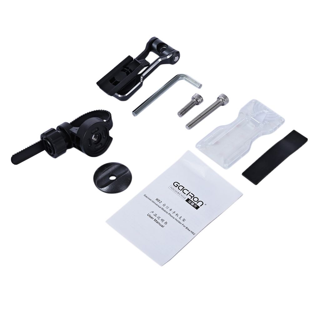Package Contents: 1 x Handlebar Holder Mount, 1 x Bracket, 1 x Sticker, 1 x Base, 2 x Screw, 1 x Pasted Tissue Tape, 1 x Wrench, 1 x Manual in English and Chinese