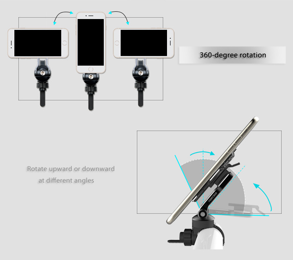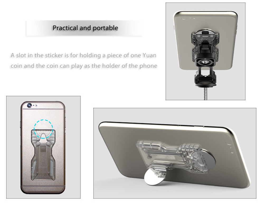 This mount allows the phones to rotate at different angles, even 360-degree rotation upward or downward. Suitable for mobile phone, PDA, GPS, MP4 to fix on the bicycle or motorcycle. The special design of a slot in the sticker is for holding a piece of one Yuan coin and the coin can play as the holder of the phone.